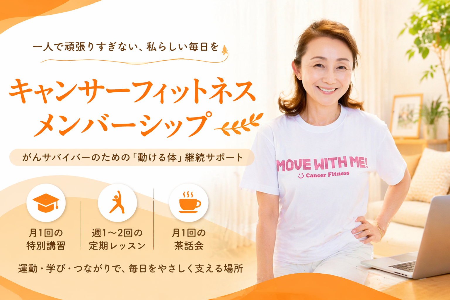 治療中のがん患者さんが、運動をして体力を回復させ、気持ちが元気になり、がんに関わる情報、相談や、仲間と繋がれるオンラインサロンです。